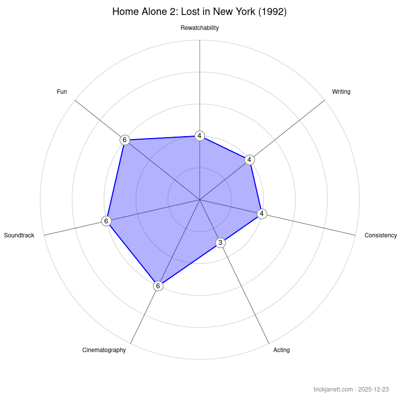 It's hard for me to explain why, but I found myself greatly disliking the second movie's decision to further rely on slapstick and painful moments with the thieves. I haven't watched Home Alone 2 in a long time and so the rewatch today made me realize how far it trails the first in my overall enjoyment.